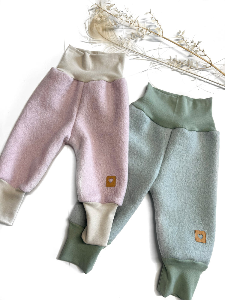 Die Hose besteht aus einem schönem kuscheligem Wollwalk und einem Bio Jersey Bündchen.